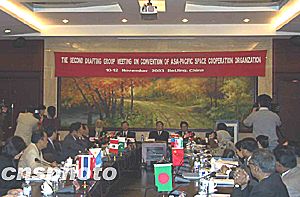 來自孟加拉國、巴西、中國、韓國、伊朗、馬來西亞、蒙古、秘魯、菲律賓、俄羅斯、泰國、巴基斯坦、烏克蘭等十五個國家的政府官員,以及聯合國有關機構的代表和觀察員出席亞太空間合作組織第二次章程起草會議。中國國家航天局局長欒恩杰致辭時說,中國政府將一如既往地支持亞太空間合作組織的建立及所開展的合作,希望亞太空間合作組織早日建立。
