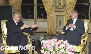 香港特區(qū)行政長官董建華十三日(巴黎時間十二日)會見法國總統(tǒng)希拉克(右),向他簡介香港的最新經濟情況。作者:中新社