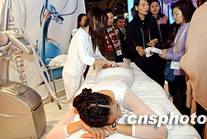 在香港舉行的“2003亞太區(qū)美容展”上,香港菲萊雅公司在現(xiàn)場(chǎng)推介美容和瘦身療法,吸引眾多愛美女士圍觀。中新社記者:洪少葵