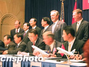 中美采購簽約儀式十二日在美國商務部舉行,中國五家航空公司從美國波音公司采購三十架波音737飛機,價值17億美元,美國商務部長埃文斯(后右二)和中國國家發(fā)展與改革委員會副主任張國寶(后右三)等出席簽字儀式。中新社記者:余東暉