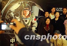 十一月十五日,夢(mèng)系太空——人類航天事業(yè)歷程與成就展在北京中國(guó)科技館揭幕,來(lái)自北京華文學(xué)院的海外僑生們興致勃勃與心儀已久的太空英雄楊利偉合影留念。中新社記者:武仲林