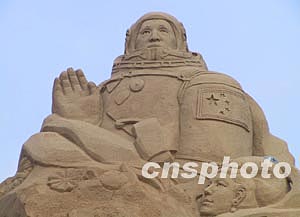 首屆海口國際沙雕賽十一月十五日在海口市西海岸大海邊開雕。來自中國、美國、西班牙等七個國家的數(shù)十名沙雕藝術家們參加本次比賽。圖為中國藝術家們雕刻的航天英雄楊利偉形象。中新社記者:王辛莉