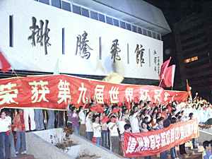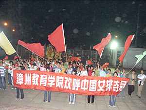 中國女排此次出征日本參加第九屆女排世界杯賽牽動著漳州人民的心。今年十月月二十五日,中國女排出征前一天,漳州市委書記袁榮祥親自打電話給中國女排主教練陳忠和,預(yù)祝中國女排在比賽中一切順利,再創(chuàng)輝煌。十一月十五日晚,得知中國女排以十一場全勝不敗的戰(zhàn)績最終捧回了闊別十七年的世界冠軍獎杯,漳州各界群眾歡欣鼓舞,紛紛走上街頭慶祝。當晚十九時,中共漳州市委、漳州市政府,中共漳州市委書記袁榮詳、漳州市市長何錦龍,中國女排主教練陳忠和的家鄉(xiāng)漳州龍海市委、市政府分別向中國女排及陳忠和發(fā)去賀信、賀電,祝賀中國女排再奪桂冠。