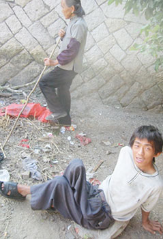 12月6日記者采訪了戴家。戴家的兩位老人已經(jīng)去世多年。扔下了4個(gè)殘疾孩子和老母親。戴家的長(zhǎng)子戴清鎮(zhèn),37歲,患有精神病,經(jīng)常發(fā)作。記者沒(méi)有看到他,據(jù)隨行的村干部說(shuō)他已經(jīng)離家出走多日,音訊全無(wú);二兒子戴金龍,30歲,癡呆,沒(méi)有任何勞動(dòng)能力;三兒子戴振明,28歲,小兒麻痹,完全癱瘓;四兒子戴暫缺,25歲,手拄雙拐。唯一的健全人是35歲的戴雙治。她和丈夫擔(dān)負(fù)起了照顧全家的重?fù)?dān)。