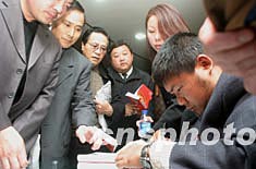 新聞周刊:今天售書的場面十分火爆,是不是因?yàn)槟闾厥獾纳矸菽兀?/b>
