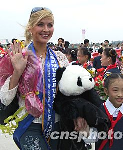 一位參賽佳麗懷抱中國國寶大熊貓紀(jì)念品。關(guān)向東 攝