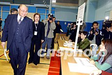選舉管理委員會主席胡國興法官到達九龍公園投票站參觀,對準(zhǔn)備就緒的投票站設(shè)施感到滿意。中新社記者:洪少葵
