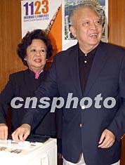 香港特別行政區(qū)行政長官董建華與夫人董趙洪娉十一月二十三日來到香港圣若瑟英文書院進行投票。 中新社記者:錢興強