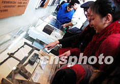 北京“井岡山大型展覽”十天引來七萬多觀眾。圖中兩位參觀的女孩正在討論眼前展品(紅軍當年蓋房子的工具)是什麼。半個多世紀前,毛澤東等在中國南方叢山峻嶺的戰(zhàn)爭故事使許多參觀者感嘆。中新社記者:王麗南