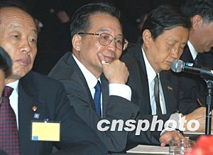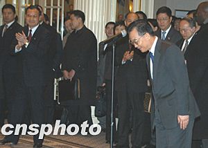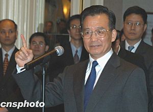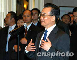 美東時間十二月七日下午,中國總理溫家寶甫抵紐約,即接見華僑華人、留學(xué)生和中資機構(gòu)代表。溫家寶說,大家冒著嚴(yán)寒風(fēng)雪,守候在這里好幾個小時,歡迎我和我的同事。大家的這份情意,不僅是給我和同事的,更是給祖國和人民的。他代表中國人民和中國政府,向旅居在美國的華僑、華人、留學(xué)生,向來自香港、澳門和臺灣的同胞,向領(lǐng)館的工作人員,致以親切的問候和良好的祝愿。隨后他向前方和左右三鞠躬,感謝僑胞們的熱情歡迎。作者:陳建