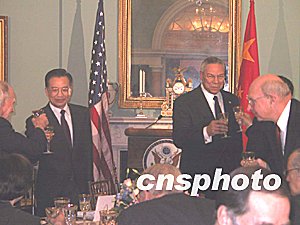 會(huì)見后,溫家寶出席了鮑威爾舉行的歡迎宴會(huì)。李肇星等中方陪同人員和美國(guó)財(cái)政部長(zhǎng)斯諾、總統(tǒng)國(guó)家安全事務(wù)助理賴斯等出席。完