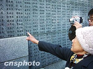 今天,江蘇省暨南京市各界人士,以及部分國外友好團體的代表、友好人士、港臺愛國同胞共3000余人,在侵華日軍南京大屠殺遇難同胞紀念館隆重悼念南京大屠殺30萬同胞遇難66周年,并舉行了南京國際和平集會。作者:丁東升  南京大屠殺幸存者夏淑琴十三日在南京“遇難者名單墻”前指認親人名單。作者:丁梅