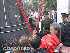 十三日,江蘇省暨南京市各界人士,以及部分國外友好團體的代表、友好人士、港臺愛國同胞共3000余人,在侵華日軍南京大屠殺遇難同胞紀念館隆重悼念南京大屠殺30萬同胞遇難66周年,并舉行了南京國際和平集會。圖為南京大屠殺幸存者李秀英、夏淑琴撞響和平大鐘。作者:丁東升  南京大屠殺遇難同胞遺屬十三日在“遇難者名單墻”前點燃燭燈祭奠亡靈。作者:丁東升