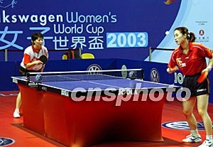 二零零三年女子世界杯乒乓球賽十二月十八日繼續(xù)在香港伊利莎伯體育館進(jìn)行,圖為中國選手王楠對加拿大選手徐光宏。中新社記者:錢興強