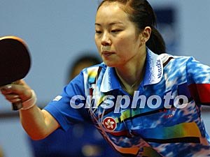 香港參賽選手帖雅娜在香港舉行的二零零三年女子世界杯乒乓球賽十二月十八日比賽上以4:0戰(zhàn)勝澳洲選手洪劍芳。中新社記者:錢興強