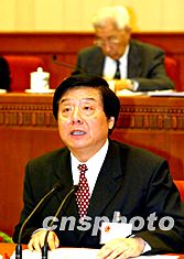 中共中央政治局委員王兆國(guó),二十二日在十屆全國(guó)人大常委會(huì)第六次會(huì)議上作中共中央關(guān)于修改憲法部分內(nèi)容建議的說(shuō)明。中新社記者:滿會(huì)喬