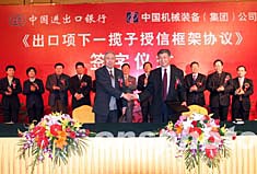 十二月二十二日,中國進(jìn)出口銀行與中國機(jī)械裝備(集團(tuán))公司在北京簽署了總額為15億美元的出口項(xiàng)下一攬子授信框架協(xié)議,主要用于支持該公司在未來三年內(nèi)的境外投資、對(duì)外承包工程及機(jī)電產(chǎn)品、高新技術(shù)產(chǎn)品出口等項(xiàng)目。圖為中國進(jìn)出口銀行蘇中副行長(前排左)和中國機(jī)械裝備(集團(tuán))公司趙風(fēng)茂(前排右)副總裁代表雙方簽署協(xié)議。中新社記者:張勤
