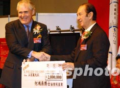特備展覽“中國(guó)首次載人航天飛行展Ⅱ--給香港的禮物”十二月二十三日在香港科學(xué)館開(kāi)幕,圖為何鴻燊博士在展覽開(kāi)幕儀式上向香港公益金捐款。中新社記者:錢(qián)興強(qiáng)