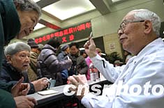 當年曾是毛主席醫(yī)療小組成員的王新德教授(右)十二月二十六日在北京醫(yī)院用為市民們義診來紀念毛主席誕辰110周年。中新社記者:史利