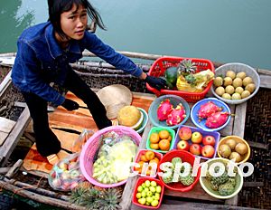 新年前越南下龍灣百姓在海面小船上向游客兜售水果。地處熱帶地區(qū)的越南冬季進(jìn)入旅游高峰,每年元旦春節(jié)都有中國大批游客到越南旅游。中新社記者:宋吉河