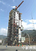 圖:"長征二號丙"改進型運載火箭一、二級吊裝上發(fā)射塔架(12月30日 03:47)