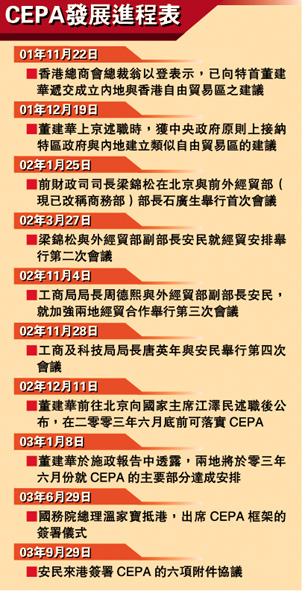 在二零零三年六月簽署的CEPA包括貨物貿(mào)易、服務貿(mào)易和貿(mào)易投資便利化三部分。其中,貨物貿(mào)易部分規(guī)定,自二零零四年一月一日起,對輸往內(nèi)地的二百七十三種原產(chǎn)于香港的貨物實行零關稅。(戴慶成)