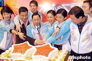 演唱會(huì)結(jié)束后,Twins與唱片公司高層吳雨及演唱會(huì)主辦機(jī)構(gòu)老板張耀榮等人舉行祝捷會(huì)切蛋糕。作者:鄧慶樂