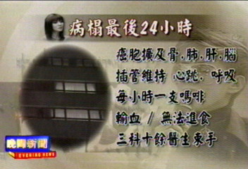 據(jù)TVBS報(bào)道,醫(yī)生表示,梅姑在世的最后一天終日迷迷糊糊,癌細(xì)胞已擴(kuò)散到骨肺肝及腦部等主要器官,靠?jī)x器維持心跳和呼吸,而且每小時(shí)打一次嗎啡。盡管養(yǎng)和醫(yī)院動(dòng)用3個(gè)?10名醫(yī)生,還是沒能救回梅姑。