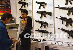 元月六日在香港會展中心開幕的“第三十屆香港玩具展”上,玩具商展示的仿真槍吸引參觀愛好者。中新社記者:錢興強