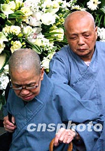 香港著名藝人梅艷芳喪禮于元月十一日設(shè)靈公祭,兩位法師來(lái)到香港殯儀館拜祭梅艷芳。中新社記者:錢興強(qiáng)