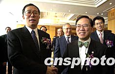 一月十五日,香港地鐵有限公司投資深圳市軌道交通四號(hào)線原則性協(xié)議在深圳簽署。該線南起皇崗口岸北至龍華新城中心,總長(zhǎng)二十一公里,總投資約人民幣六十億元,計(jì)劃二零零八年建成通車,建成后可與香港九廣鐵路落馬洲支線實(shí)現(xiàn)接駁。圖為香港政務(wù)司司長(zhǎng)曾蔭權(quán)和深圳市代市長(zhǎng)李鴻忠出席簽署儀式。作者:陳文