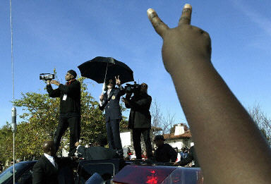 杰克遜在走到法庭建筑前時與一些歌迷握手并交談。不少歌迷已在那里等候了12個小時之久。