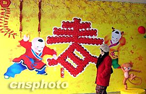 2004年1月14日,行人走過上海街頭一幅“喜娃報(bào)春”的年畫前。中國(guó)的傳統(tǒng)佳節(jié)——春節(jié)就要到來,申城街頭隨處可見傳統(tǒng)的中國(guó)年畫。井韋 攝