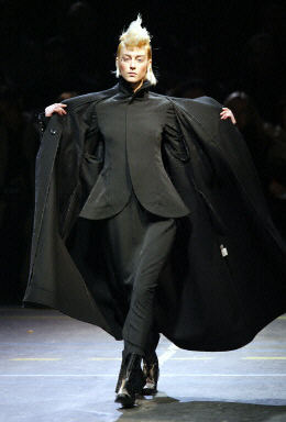 1月18日在法國(guó)巴黎,模特演繹了在服裝界中素有藝術(shù)家美稱的日本服裝設(shè)計(jì)師——山本耀司設(shè)計(jì)的2004春夏時(shí)尚女裝。