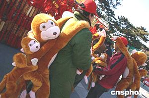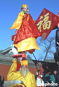 一月二十一日,第三屆北京民俗文化節(jié)暨第六屆東岳廟文化廟會隆重開幕,在廟會開幕式上來自河南新鄉(xiāng)的農(nóng)民藝術(shù)家身背架桿,正在表演“驚、險、奇、巧”為特色的民間傳統(tǒng)節(jié)目“背樁”。中新社記者:張勤  北京地壇廟會拉開帷幕,本應(yīng)猴年初一登場的猴們迫不及待提前鬧春。作者:徐曦弋