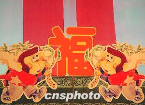 1月20日,安徽省淮北市街頭商場櫥窗內(nèi)張貼出“金猴送福”年畫,小猴造型惹人喜愛。猴年將至,各類猴年年畫層出不窮。謝正義 攝
