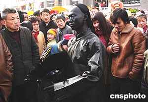 一名身著清朝裝束、渾身涂滿黑碳汁的北京年輕行為藝術(shù)表演者,22日大年初一在北京第四屆廠甸兒廟會(huì)上以真假難辨的人體雕塑造型向市民再現(xiàn)舊時(shí)市井民俗。中新社記者:鄒憲