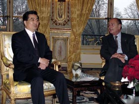 胡錦濤在機場出席了希拉克主持的隆重歡迎儀式后直接來到愛麗舍宮,這是兩國元首此次訪問期間的首次會談。
