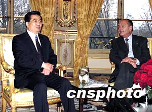 一月二十六日下午,正在法國進(jìn)行國事訪問的中國國家主席胡錦濤與法國總統(tǒng)希拉克在愛麗舍宮舉行會談。作者:蔚中