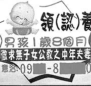 最近在臺(tái)中地區(qū)有一則夾報(bào)小廣告,登載者希望尋找沒(méi)有子女的中年公務(wù)員,收養(yǎng)他一歲八個(gè)月大的幼兒,廣告上留有行動(dòng)電話,由于春節(jié)前后類(lèi)似的廣告有多起,引人注意,有多人打電話詢(xún)問(wèn)對(duì)方原因,關(guān)心小孩處境。