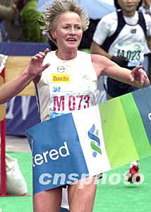 “渣打馬拉松2004”二月八日在香港舉行,來(lái)自丹麥的選手卡妤爾奪得該賽公開(kāi)組女子冠軍。圖為卡妤爾在終點(diǎn)沖刺。 作者:錢(qián)興強(qiáng)