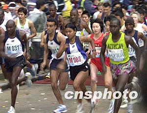 “渣打馬拉松2004”二月八日在香港舉行,超過(guò)二萬(wàn)四千名香港及海外參賽者冒雨角逐。 作者:錢(qián)興強(qiáng)