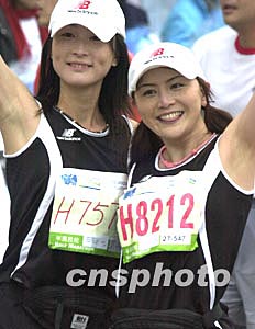 “渣打馬拉松2004”二月八日在香港舉行,萬(wàn)人冒雨參加了比賽,圖為兩名參賽女士賽后興高采烈拍照。 作者:錢(qián)興強(qiáng)
