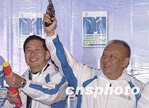 “渣打馬拉松2004”二月八日在香港舉行,香港特別行政區(qū)行政長(zhǎng)官董建華、渣打銀行大中華區(qū)總裁王冬勝在起跑儀式上為馬拉松主持鳴槍禮。 作者:錢(qián)興強(qiáng)