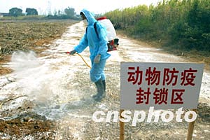 中國內(nèi)地首發(fā)禽流感疫點--隆安縣丁當(dāng)電灌站入口二月十二日工作人員在定時消毒。疫情發(fā)生后,這里嚴(yán)格按照規(guī)定進(jìn)行定時消毒。中新社記者:宋吉河