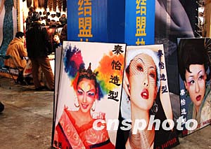 十三日,中國(guó)影樓、婚紗用品展在北京舉行,一銷售假發(fā)的參展商推出美侖美奐的造型圖片吸引商家加盟。中新社記者:王麗南