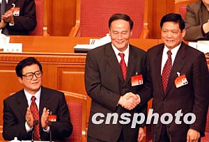 二月二十一日,王岐山(中)在北京市十二屆人大二次會(huì)議上以高票當(dāng)選北京市市長,中共北京市委書記劉淇(右)、市人大委員會(huì)主任于均波向王岐山表示祝賀。中新社記者:張宇