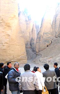 中國國土資源部日前公布,四川九寨溝、甘肅景泰石林等被評為“國家地質(zhì)公園”。甘肅景泰石林位于甘肅省景泰縣,生成于四百萬年前,由地殼運(yùn)動(dòng)、風(fēng)化、流水侵蝕和重力崩塌形成,其石柱、石筍均由桔黃色砂礫巖構(gòu)成,大多高達(dá)八十至一百米之間,最高達(dá)二百多米。圖為聯(lián)合國教科文基金水利工程協(xié)會(huì)的專家前來考察屹立在黃河兩岸的甘肅景泰石林。作者:殷春永