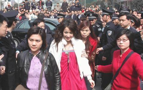 14時25分,正當所有人都在為“蕭亞軒是否能到場”的問題擔憂時,蕭亞軒突然出其不意出現(xiàn)在了舞臺上,而且她未說一個字就開始唱起了《地下鐵》的主題曲。燙著酒紅色卷發(fā)、穿著紅色裙子、白色皮草的蕭亞軒看上去就像一個可愛的洋娃娃,而可愛的她顯然被眼前人頭攢動的景象嚇壞了。在剛開口唱歌時,她的聲音完全跑調(diào),握著話筒的手也不停地發(fā)抖。差不多唱了1分鐘后,她才恢復神智,開始意識到要向臺下歌迷揮手。哪知她這一揮手,在保安和警察人墻外的歌迷簡直失去了理智,尖叫著拼命往前擠,最終沖倒一名保安,幾十名歌迷瞬間擠進場內(nèi),坐在臺下的近百名記者和工作人員紛紛往外逃竄。此時,蕭亞軒正唱到歌曲的結(jié)尾部分,她的女經(jīng)紀人見勢不妙,沖上舞臺把她往臺后拉;見歌迷失控,經(jīng)紀人干脆臨時充當起了“保鏢”,攔腰抱住蕭亞軒,然后在10多名保安的保護下左沖右突,上了一輛等在現(xiàn)場的黑色別克轎車匆匆離開。從蕭亞軒亮相到離開,前后不到5分鐘。