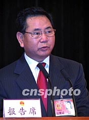 海南省三屆人大二次會(huì)議二月二十四至二十八日在?谂e行,會(huì)議將選舉產(chǎn)生省長。圖為代省長衛(wèi)留成在會(huì)上作政府工作報(bào)告。作者:王辛莉